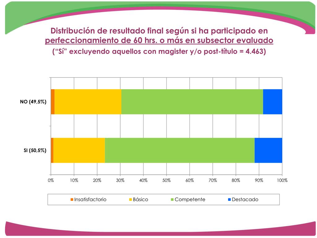 Distribución de resultado final según si ha participado en perfeccionamiento de 60 hrs. o más en subsector evaluado(“Sí” excluyendo aquellos con magister y/o post-título = 4.463)