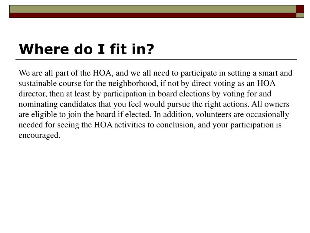 Where do I fit in? We are all part of the HOA, and we all need to participate in setting a smart and sustainable course for the neighborhood, if not by direct voting as an HOA director, then at least by participation in board elections by voting for and nominating candidates that you feel would pursue the right actions. All owners are eligible to join the board if elected. In addition, volunteers are occasionally needed for seeing the HOA activities to conclusion, and your participation is encouraged.