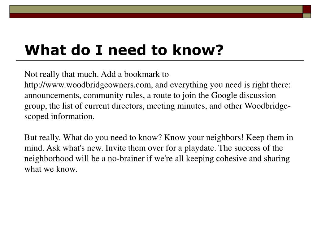 What do I need to know? Not really that much. Add a bookmark to http://www.woodbridgeowners.com, and everything you need is right there: announcements, community rules, a route to join the Google discussion group, the list of current directors, meeting minutes, and other Woodbridge-scoped information. But really. What do you need to know? Know your neighbors! Keep them in mind. Ask what's new. Invite them over for a playdate. The success of the neighborhood will be a no-brainer if we're all keeping cohesive and sharing what we know.