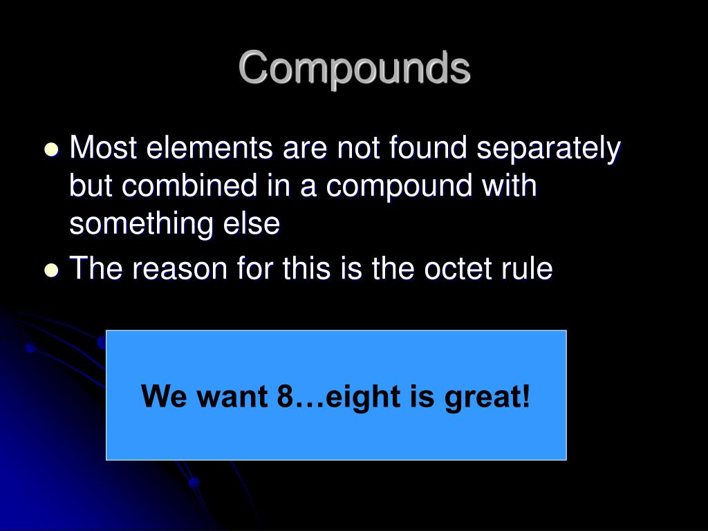 Compounds • Most elements are not found separately but combined in a compound with something else • The reason for this is the octet rule We want 8…eight is great!