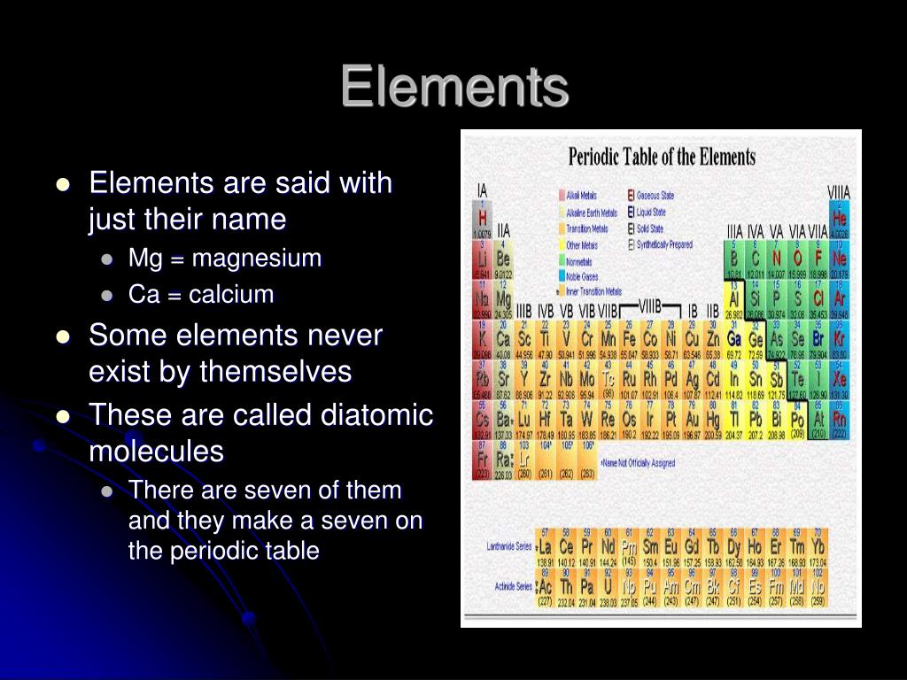Elements • Elements are said with just their name • Mg = magnesium • Ca = calcium • Some elements never exist by themselves • These are called diatomic molecules • There are seven of them and they make a seven on the periodic table