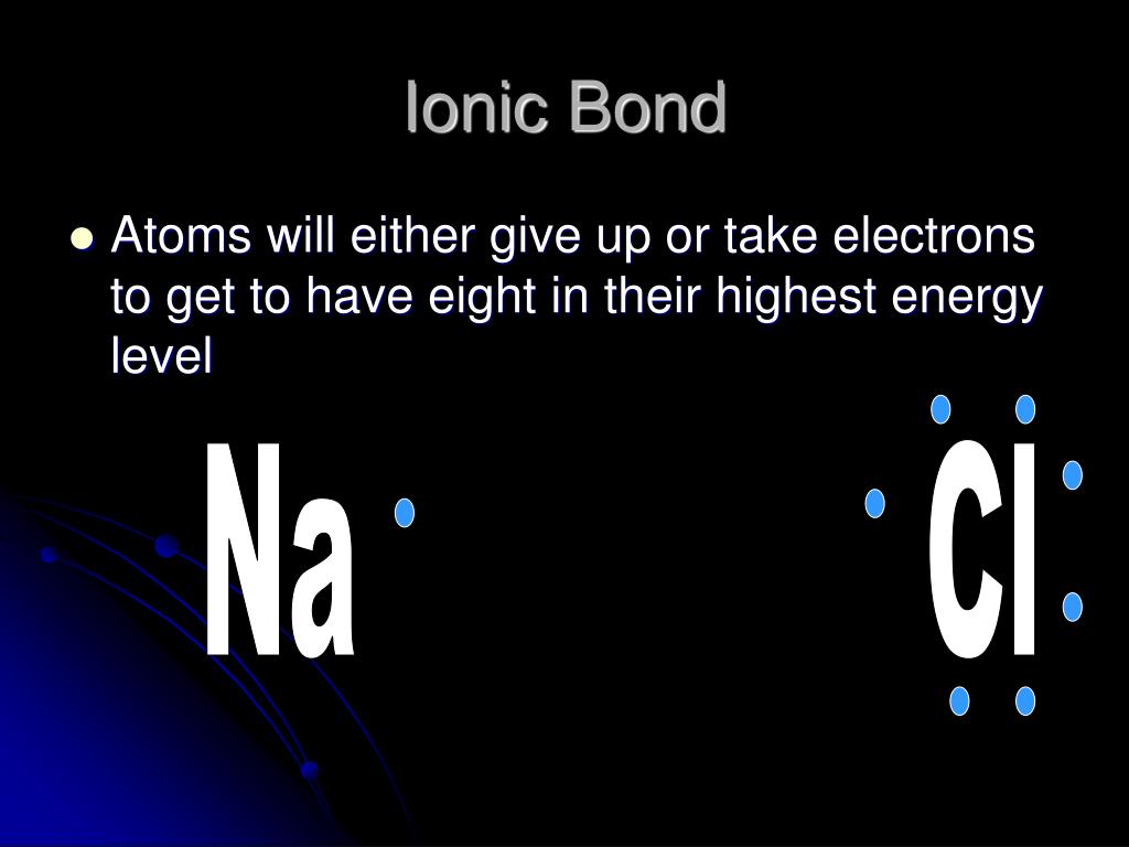 Na Cl Ionic Bond • Atoms will either give up or take electrons to get to have eight in their highest energy level