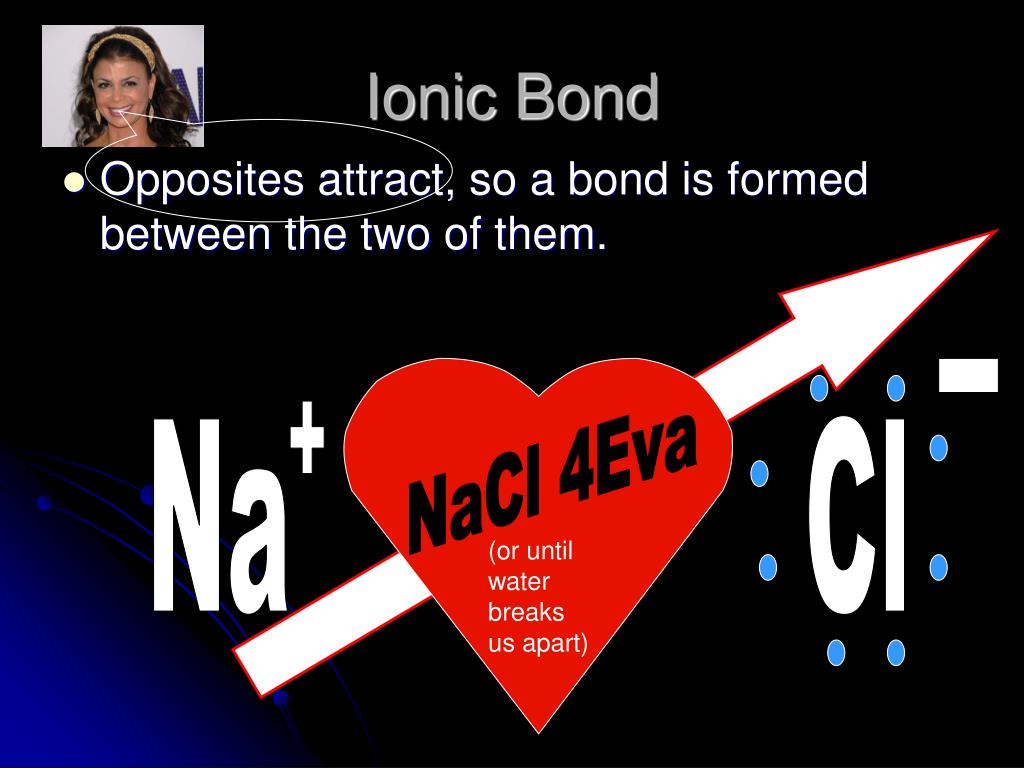 - NaCl 4Eva + Na Cl (or until water breaks us apart) Ionic Bond • Opposites attract, so a bond is formed between the two of them.