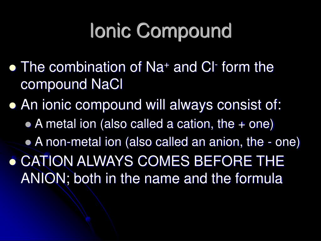 Ionic Compound • The combination of Na+ and Cl- form the compound NaCl • An ionic compound will always consist of: • A metal ion (also called a cation, the + one) • A non-metal ion (also called an anion, the - one) • CATION ALWAYS COMES BEFORE THE ANION; both in the name and the formula