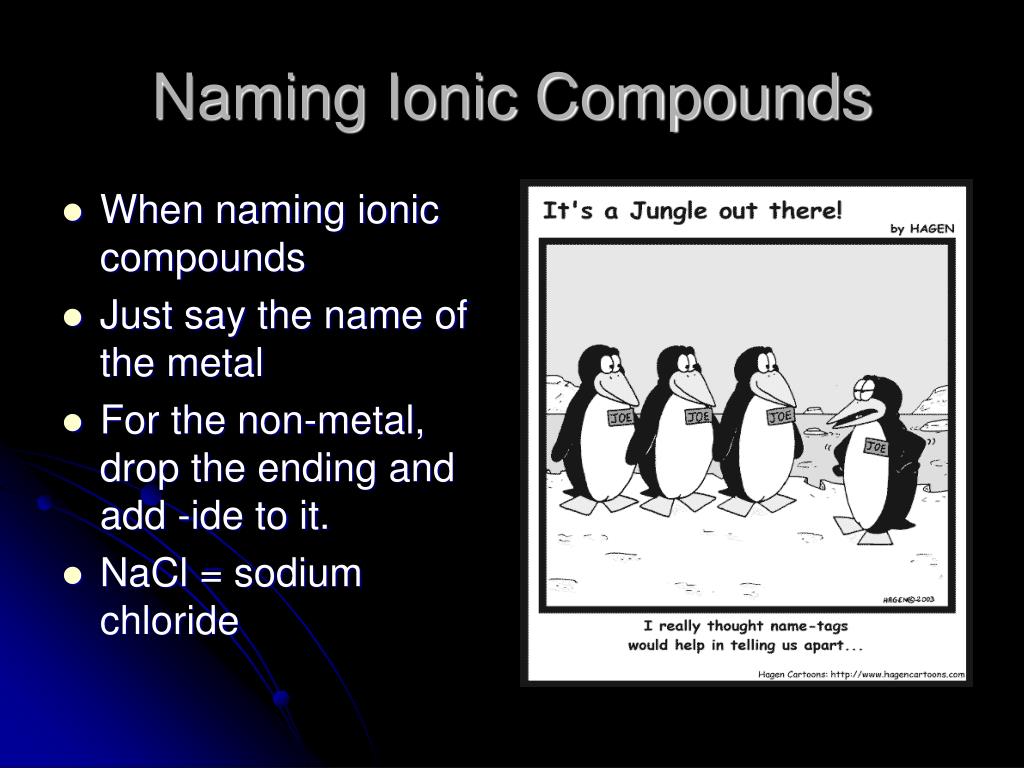 Naming Ionic Compounds • When naming ionic compounds • Just say the name of the metal • For the non-metal, drop the ending and add -ide to it. • NaCl = sodium chloride