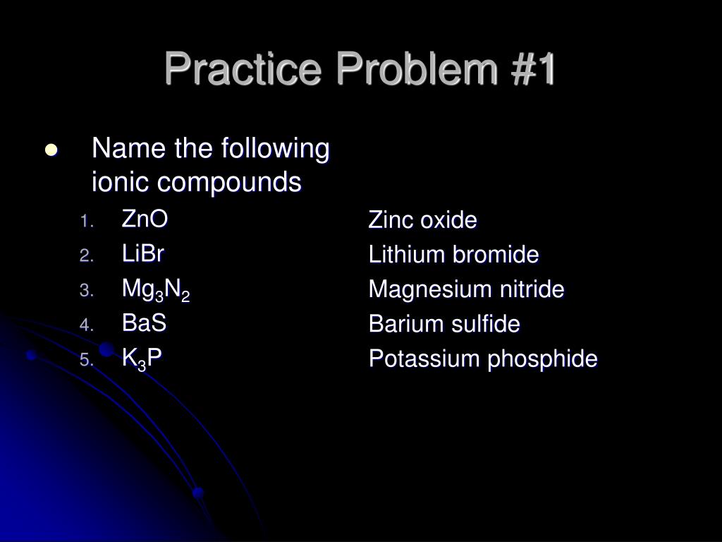 Name the following ionic compounds ZnO LiBr Mg3N2 BaS K3P Zinc oxide Lithium bromide Magnesium nitride Barium sulfide Potassium phosphide Practice Problem #1