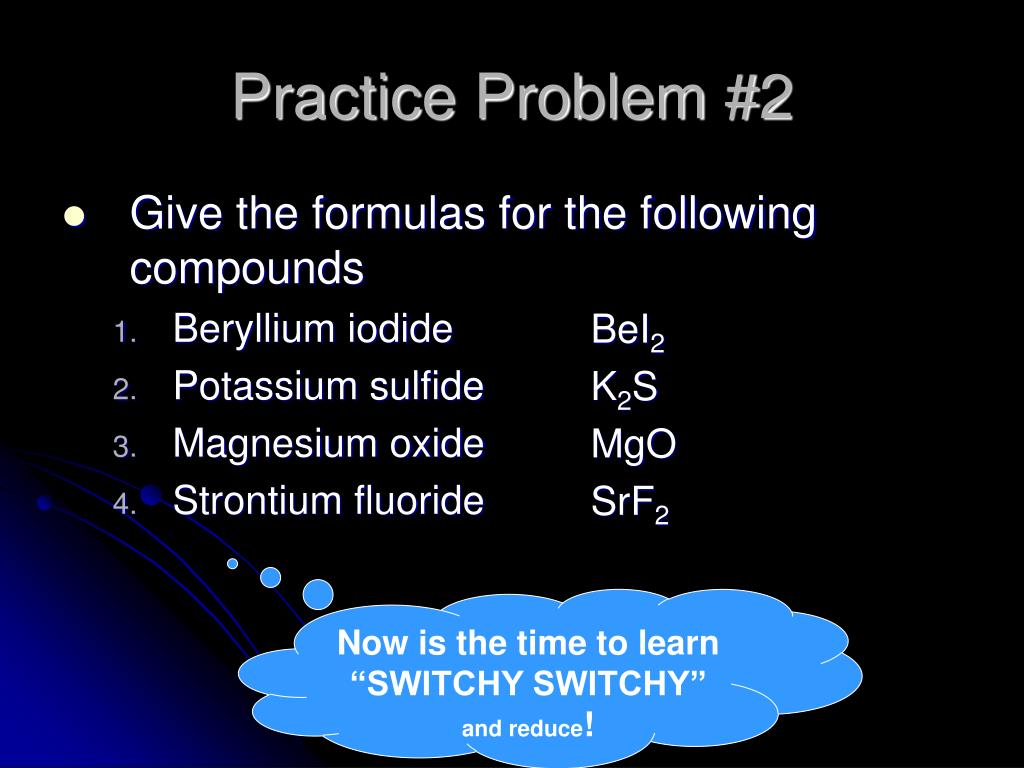 Practice Problem #2 • Give the formulas for the following compounds • Beryllium iodide • Potassium sulfide • Magnesium oxide • Strontium fluoride BeI2 K2S MgO SrF2 Now is the time to learn “SWITCHY SWITCHY” and reduce!