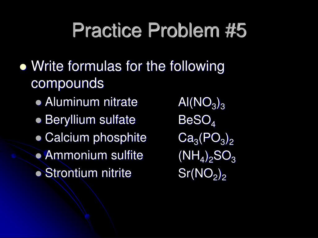Practice Problem #5 • Write formulas for the following compounds • Aluminum nitrate • Beryllium sulfate • Calcium phosphite • Ammonium sulfite • Strontium nitrite Al(NO3)3 BeSO4 Ca3(PO3)2 (NH4)2SO3 Sr(NO2)2
