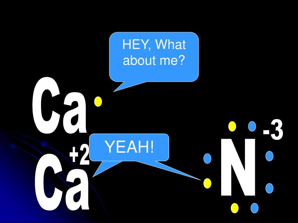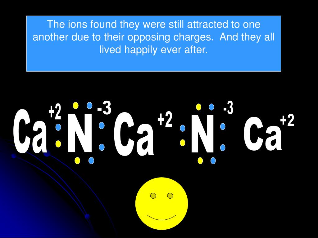 +2 Ca -3 +2 Ca -3 N N +2 Ca The ions found they were still attracted to one another due to their opposing charges. And they all lived happily ever after.