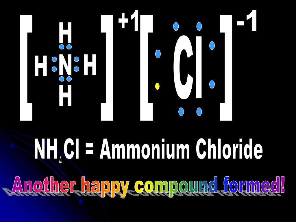 +1 -1 [ [ [ [ H Cl N H H NH Cl = Ammonium Chloride H 4 Another happy compound formed!