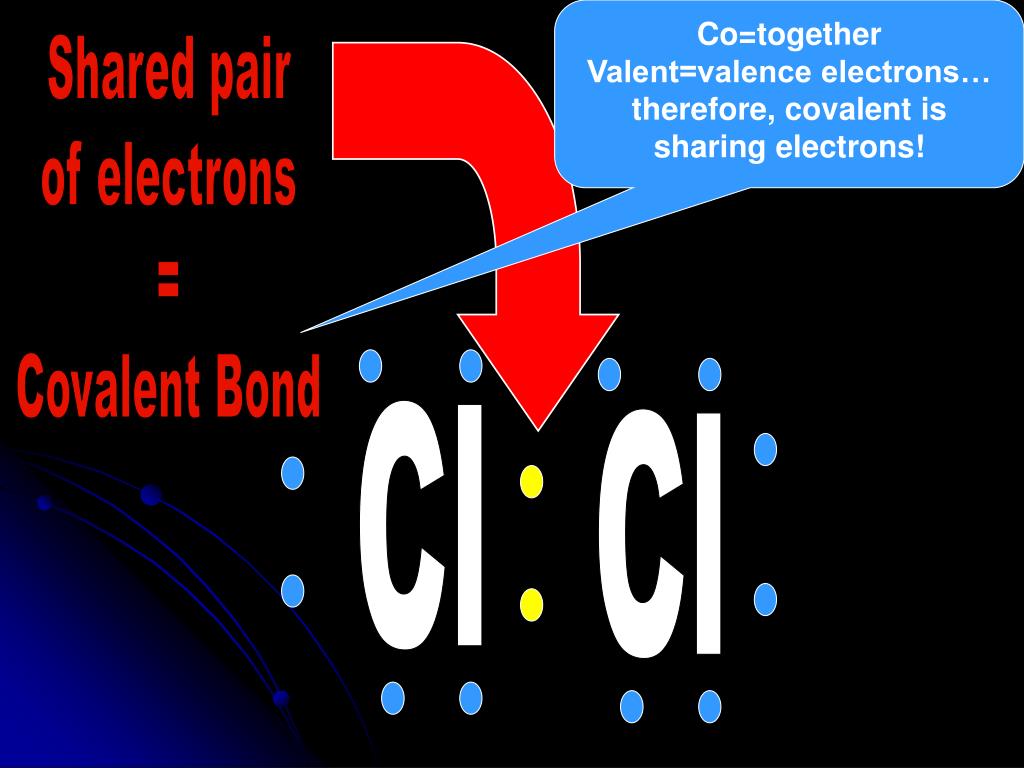 Co=together Valent=valence electrons… therefore, covalent is sharing electrons! Cl Cl Shared pair of electrons = Covalent Bond