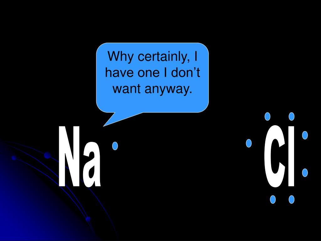 Na Cl Hey, can you help me out and gimme an electron?