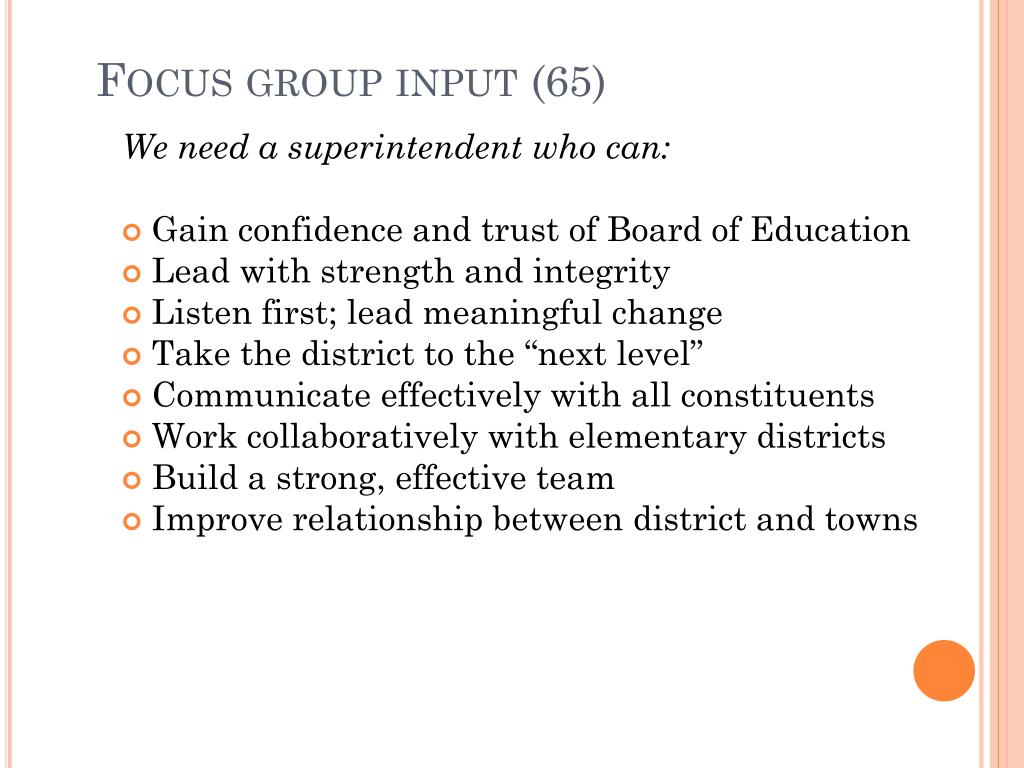 Focus group input (65) We need a superintendent who can: • Gain confidence and trust of Board of Education • Lead with strength and integrity • Listen first; lead meaningful change • Take the district to the “next level” • Communicate effectively with all constituents • Work collaboratively with elementary districts • Build a strong, effective team • Improve relationship between district and towns