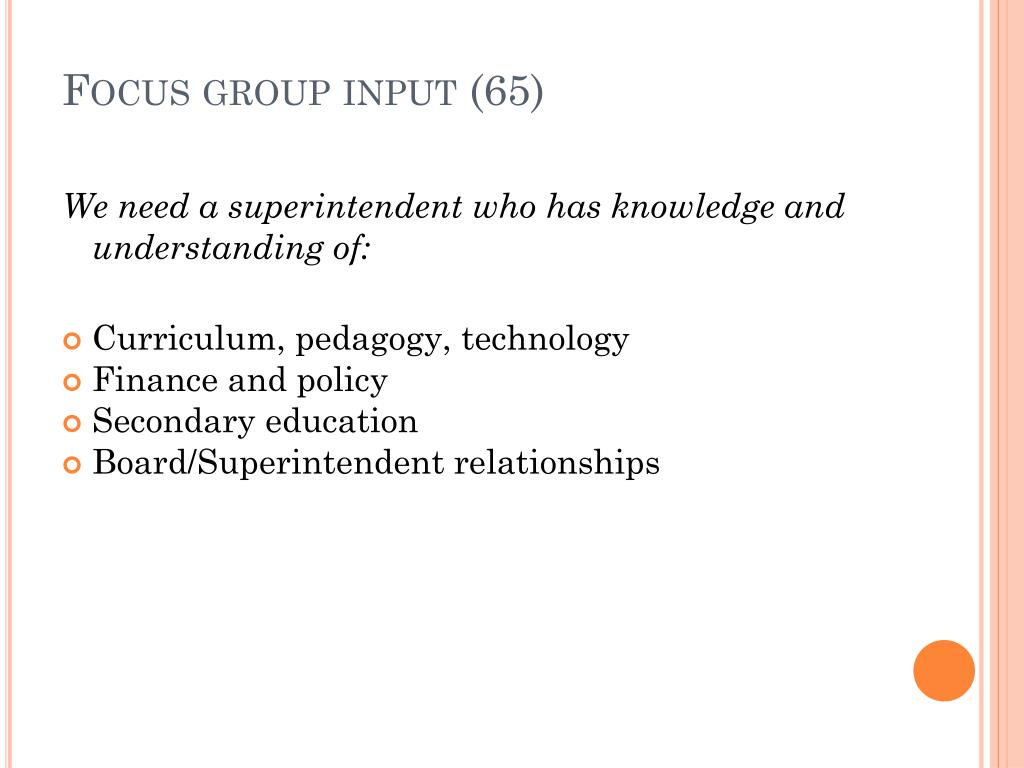 Focus group input (65) We need a superintendent who has knowledge and understanding of: • Curriculum, pedagogy, technology • Finance and policy • Secondary education • Board/Superintendent relationships