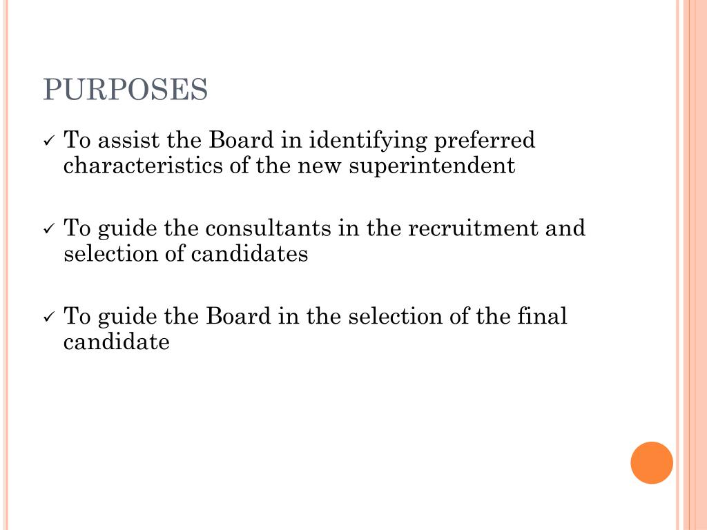 PURPOSES • To assist the Board in identifying preferred characteristics of the new superintendent • To guide the consultants in the recruitment and selection of candidates • To guide the Board in the selection of the final candidate