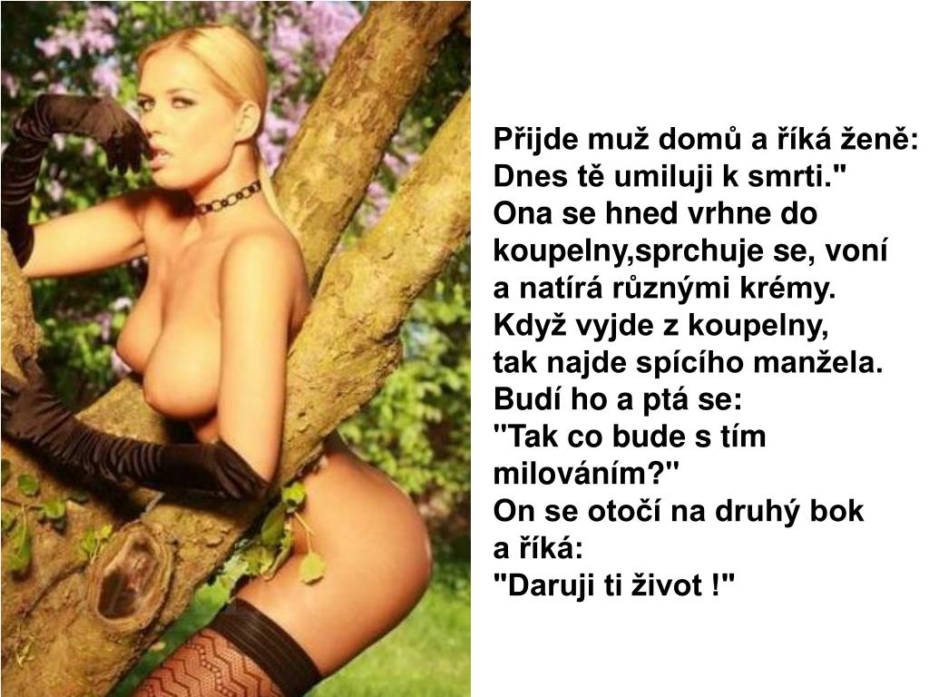 Přijde muž domů a říká ženě:Dnes tě umiluji k smrti."Ona se hned vrhne do koupelny,sprchuje se, voní a natírá různými krémy.Když vyjde z koupelny, tak najde spícího manžela.Budí ho a ptá se:"Tak co bude s tím milováním?"On se otočí na druhý bok a říká:"Daruji ti život !"