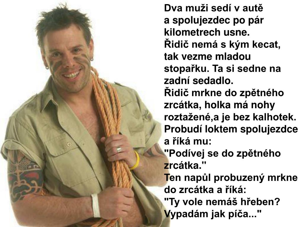 Dva muži sedí v autě a spolujezdec po pár kilometrech usne. Řidič nemá s kým kecat, tak vezme mladou stopařku. Ta si sedne na zadní sedadlo. Řidič mrkne do zpětného zrcátka, holka má nohy roztažené,a je bez kalhotek.Probudí loktem spolujezdce a říká mu:"Podívej se do zpětného zrcátka." Ten napůl probuzený mrkne do zrcátka a říká:"Ty vole nemáš hřeben? Vypadám jak píča..."