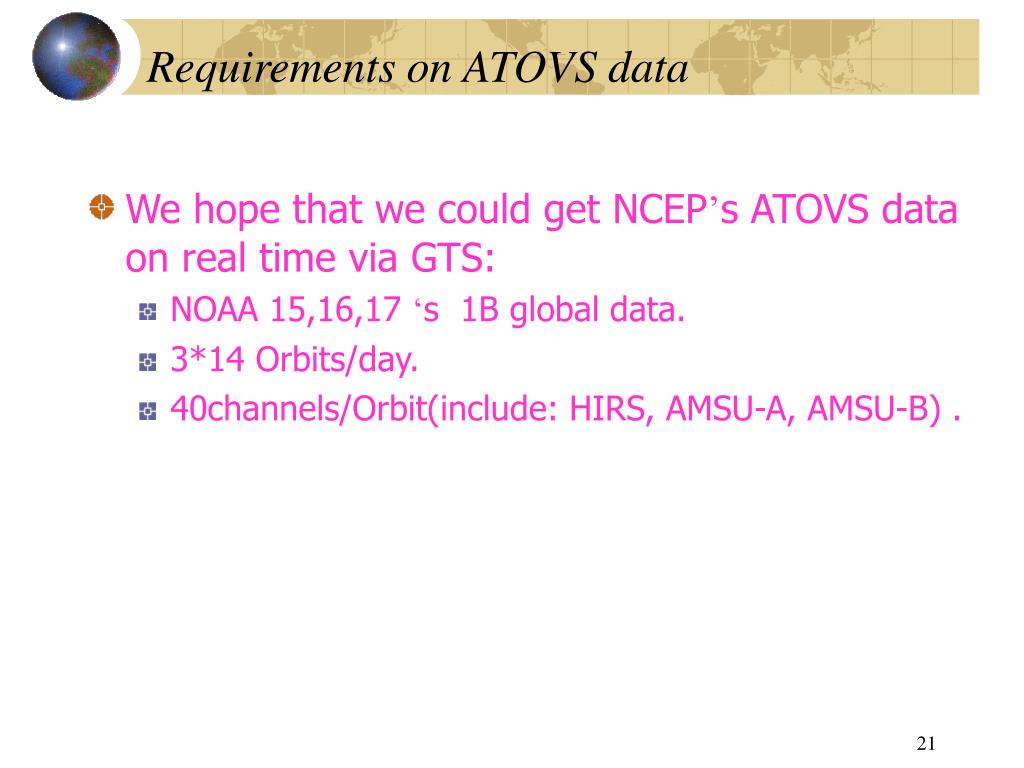 Requirements on ATOVS data • We hope that we could get NCEP’s ATOVS data on real time via GTS: • NOAA 15,16,17 ‘s 1B global data. • 3*14 Orbits/day. • 40channels/Orbit(include: HIRS, AMSU-A, AMSU-B) .