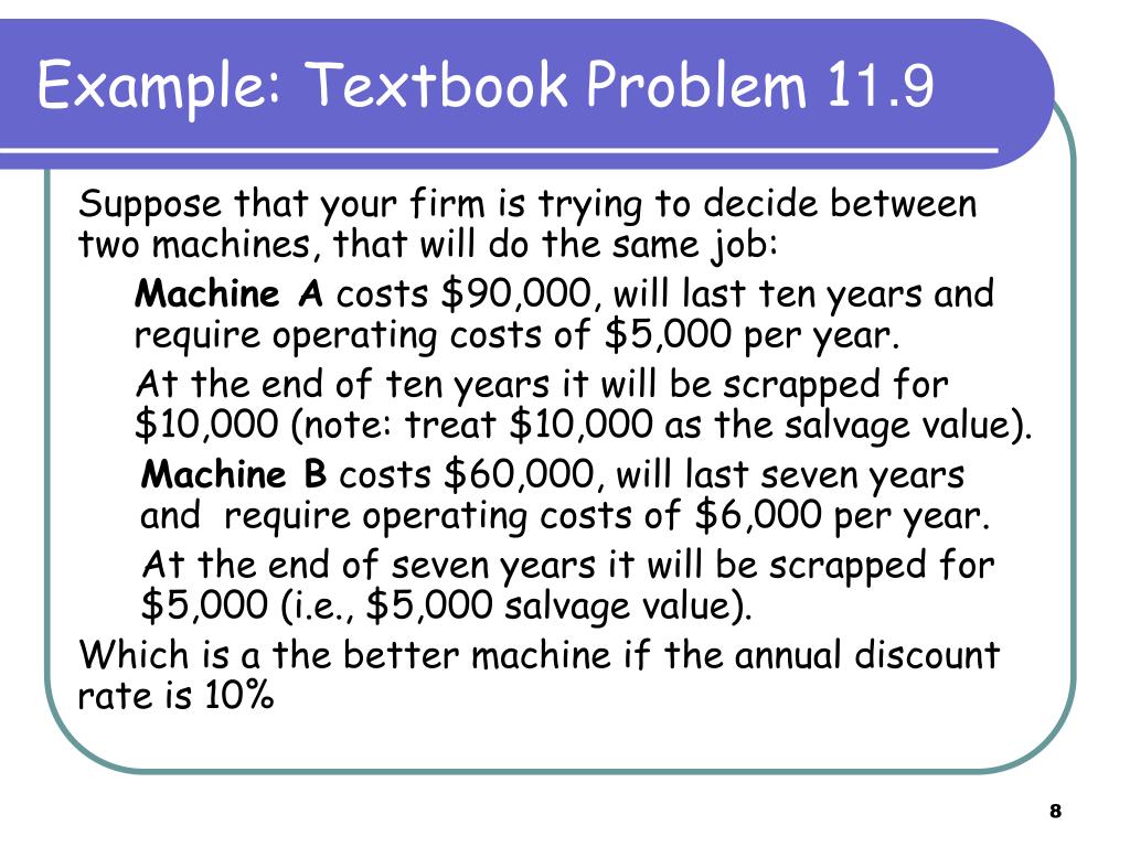 Example: Textbook Problem 11.9 Suppose that your firm is trying to decide between two machines, that will do the same job: Machine A costs $90,000, will last ten years and require operating costs of $5,000 per year. At the end of ten years it will be scrapped for $10,000 (note: treat $10,000 as the salvage value). Machine B costs $60,000, will last seven years and require operating costs of $6,000 per year. At the end of seven years it will be scrapped for $5,000 (i.e., $5,000 salvage value). Which is a the better machine if the annual discount rate is 10%