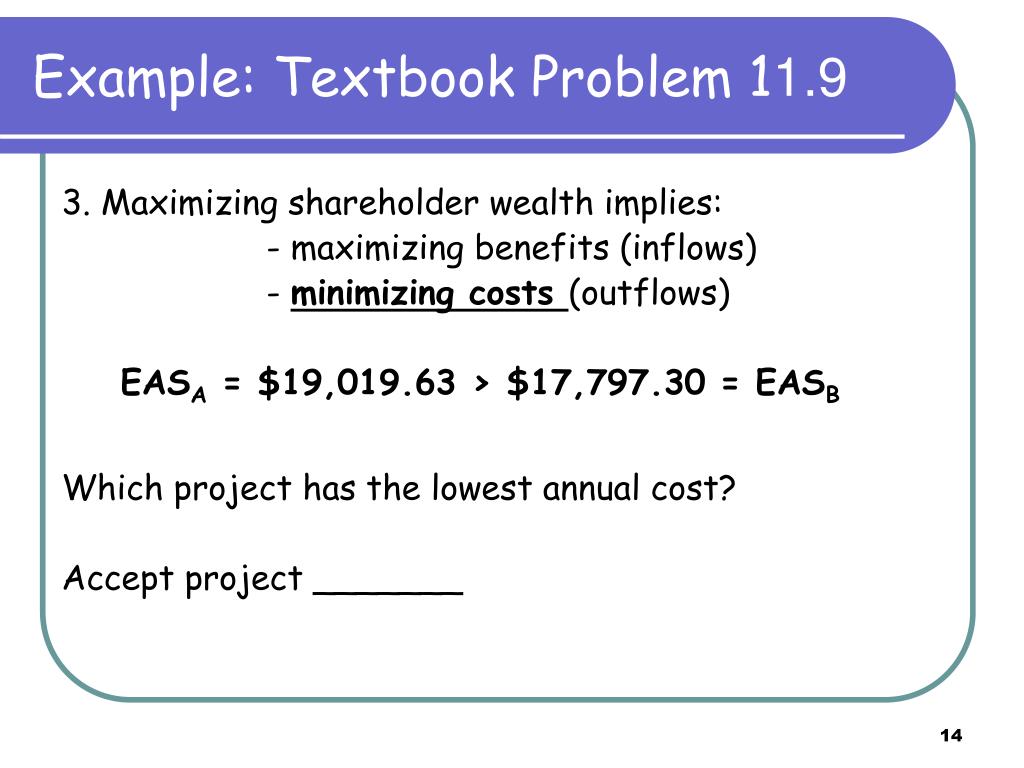 Example: Textbook Problem 11.9 3. Maximizing shareholder wealth implies: - maximizing benefits (inflows) - minimizing costs (outflows) EASA = $19,019.63 > $17,797.30 = EASB Which project has the lowest annual cost? Accept project _______