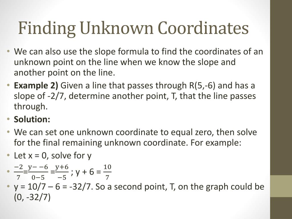 Finding Unknown Coordinates • We can also use the slope formula to find the coordinates of an unknown point on the line when we know the slope and another point on the line. • Example 2) Given a line that passes through R(5,-6) and has a slope of -2/7, determine another point, T, that the line passes through. • Solution: • We can set one unknown coordinate to equal zero, then solve for the final remaining unknown coordinate. For example: • Let x = 0, solve for y • = = ; y + 6 = • y = 10/7 – 6 = -32/7. So a second point, T, on the graph could be (0, -32/7)