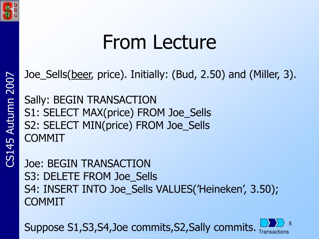 CS145 Autumn 2007 From Lecture Joe_Sells(beer, price). Initially: (Bud, 2.50) and (Miller, 3). Sally: BEGIN TRANSACTION S1: SELECT MAX(price) FROM Joe_Sells S2: SELECT MIN(price) FROM Joe_Sells COMMIT Joe: BEGIN TRANSACTION S3: DELETE FROM Joe_Sells S4: INSERT INTO Joe_Sells VALUES(’Heineken’, 3.50); COMMIT Suppose S1,S3,S4,Joe commits,S2,Sally commits. Transactions