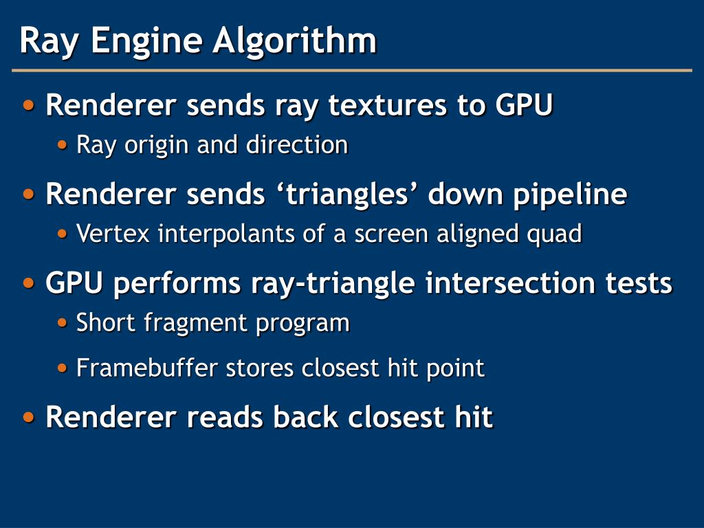 Ray Engine – Main Idea • Ray-traingle intersection done by GPU • CPU-based renderer does everything else