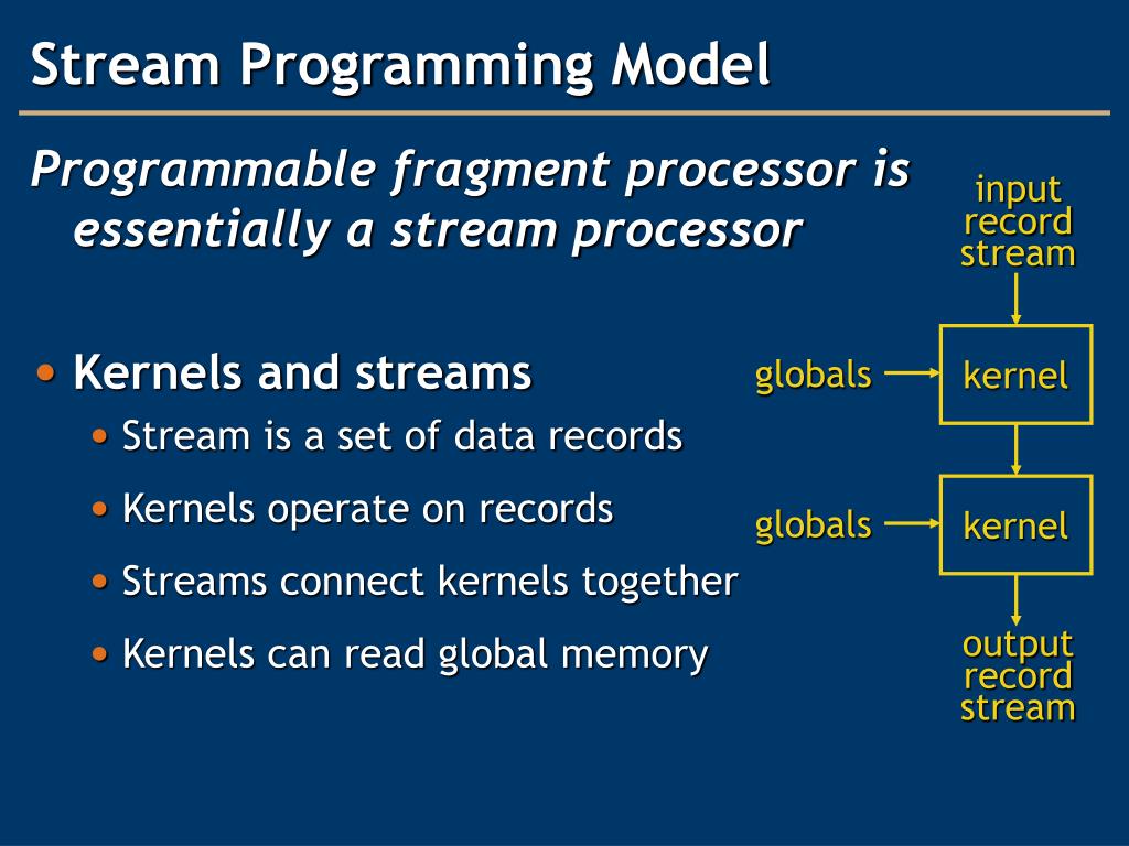 input record stream kernel globals kernel globals output record stream Stream Programming Model Programmable fragment processor is essentially a stream processor • Kernels and streams • Stream is a set of data records • Kernels operate on records • Streams connect kernels together • Kernels can read global memory