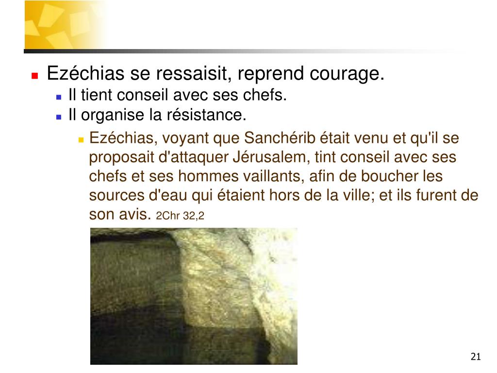 Ezéchias se ressaisit, reprend courage. • Il tient conseil avec ses chefs. • Il organise la résistance. • Ezéchias, voyant que Sanchérib était venu et qu'il se proposait d'attaquer Jérusalem, tint conseil avec ses chefs et ses hommes vaillants, afin de boucher les sources d'eau qui étaient hors de la ville; et ils furent de son avis. 2Chr 32,2