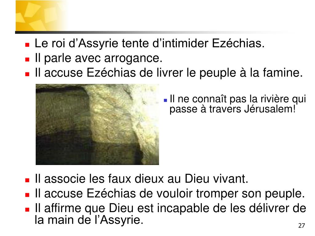Le roi d’Assyrie tente d’intimider Ezéchias. • Il parle avec arrogance. • Il accuse Ezéchias de livrer le peuple à la famine. • Il ne connaît pas la rivière qui passe à travers Jérusalem! • Il associe les faux dieux au Dieu vivant. • Il accuse Ezéchias de vouloir tromper son peuple. • Il affirme que Dieu est incapable de les délivrer de la main de l’Assyrie.
