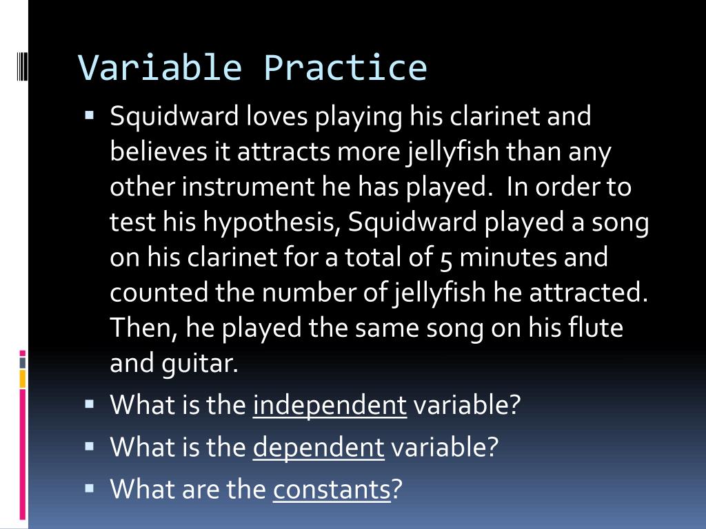 Variable Practice • Squidward loves playing his clarinet and believes it attracts more jellyfish than any other instrument he has played. In order to test his hypothesis, Squidward played a song on his clarinet for a total of 5 minutes and counted the number of jellyfish he attracted. Then, he played the same song on his flute and guitar. • What is the independent variable? • What is the dependent variable? • What are the constants?