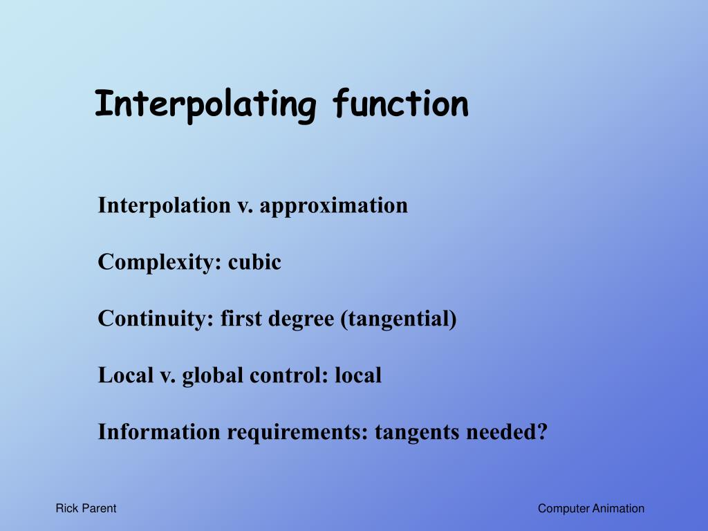 Interpolating function Interpolation v. approximation Complexity: cubic Continuity: first degree (tangential) Local v. global control: local Information requirements: tangents needed?