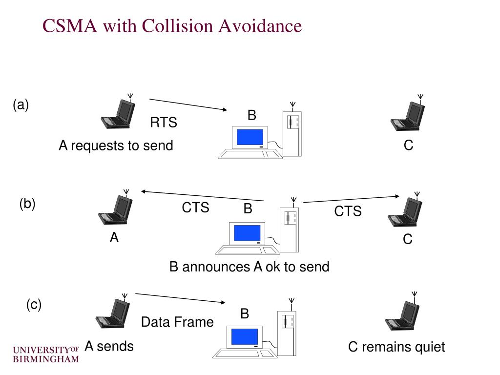 CSMA with Collision Avoidance (a) B RTS C A requests to send (b) CTS B CTS A C B announces A ok to send (c) B Data Frame A sends C remains quiet