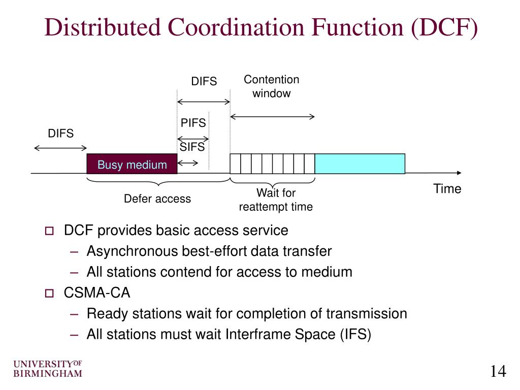 Distributed Coordination Function (DCF) Contention window DIFS PIFS DIFS SIFS Busy medium Next frame Time Wait for reattempt time Defer access • DCF provides basic access service • Asynchronous best-effort data transfer • All stations contend for access to medium • CSMA-CA • Ready stations wait for completion of transmission • All stations must wait Interframe Space (IFS)