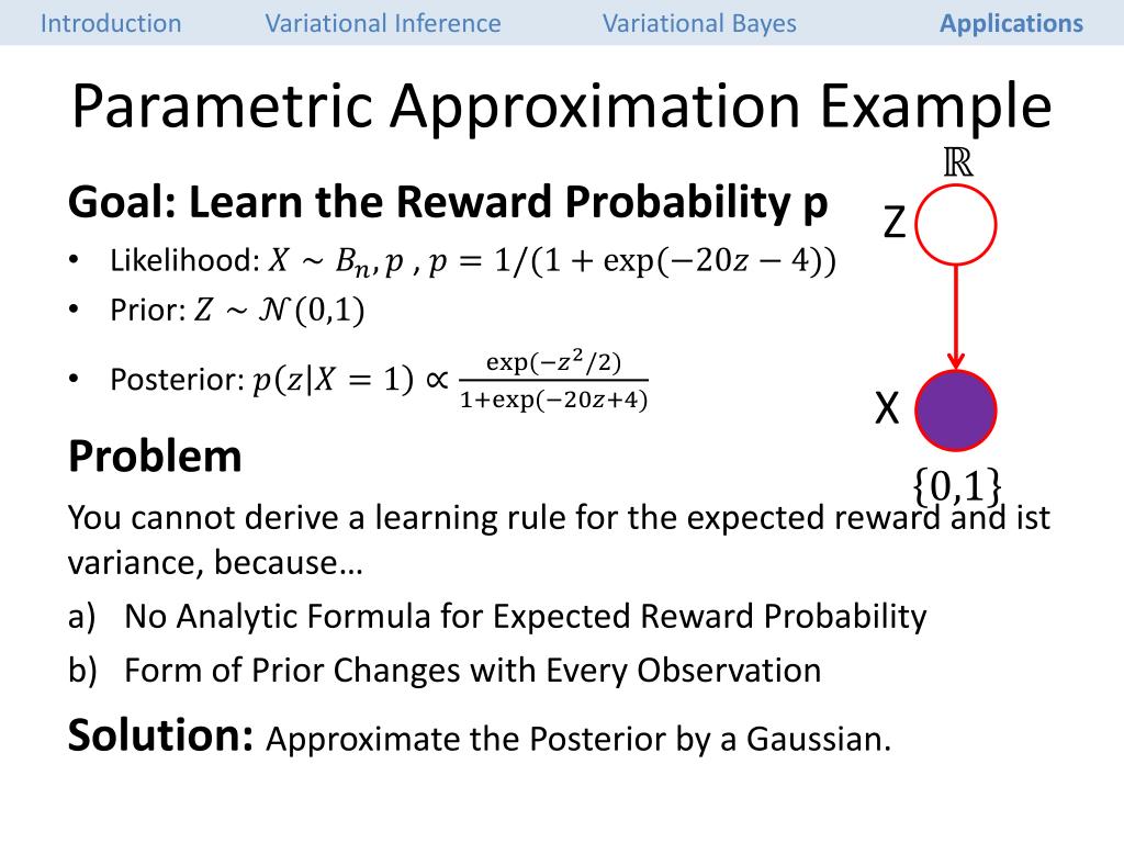 IntroductionVariationalInferenceVariational Bayes Applications Parametric Approximation Example Z Goal: LearntheRewardProbability p • Likelihood: , • Prior: • Posterior: Problem Youcannotderive a learningrulefortheexpectedrewardand ist variance, because… • NoAnalyticFormulaforExpectedRewardProbability • Form of Prior Changeswith Every Observation Solution: Approximatethe Posterior by a Gaussian. X