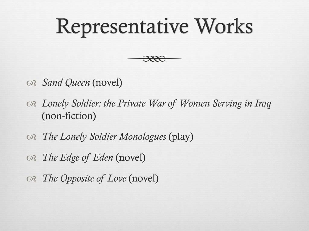 Representative Works Sand Queen (novel) Lonely Soldier: the Private War of Women Serving in Iraq (non-fiction) The Lonely Soldier Monologues (play) The Edge of Eden (novel) The Opposite of Love (novel)
