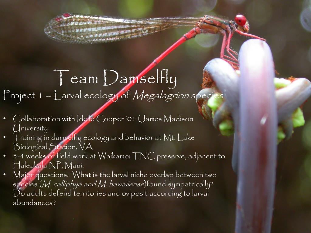 Team Damselfly • Project 1 – Larval ecology of Megalagrionspecies • Collaboration with Idelle Cooper ‘01 (James Madison University • Training in damselfly ecology and behavior at Mt. Lake Biological Station, VA • 3-4 weeks of field work at Waikamoi TNC preserve, adjacent to Haleakala NP, Maui. • Major questions: What is the larval niche overlap between two species (M. calliphya and M. hawaiiense)found sympatrically? Do adults defend territories and oviposit according to larvalabundances?