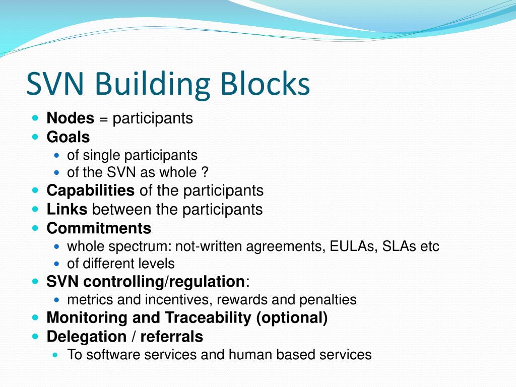 SVN Building Blocks • Nodes = participants • Goals • of single participants • of the SVN as whole ? • Capabilities of the participants • Links between the participants • Commitments • whole spectrum: not-written agreements, EULAs, SLAs etc • of different levels • SVN controlling/regulation: • metrics and incentives, rewards and penalties • Monitoring and Traceability (optional) • Delegation / referrals • To software services and human based services