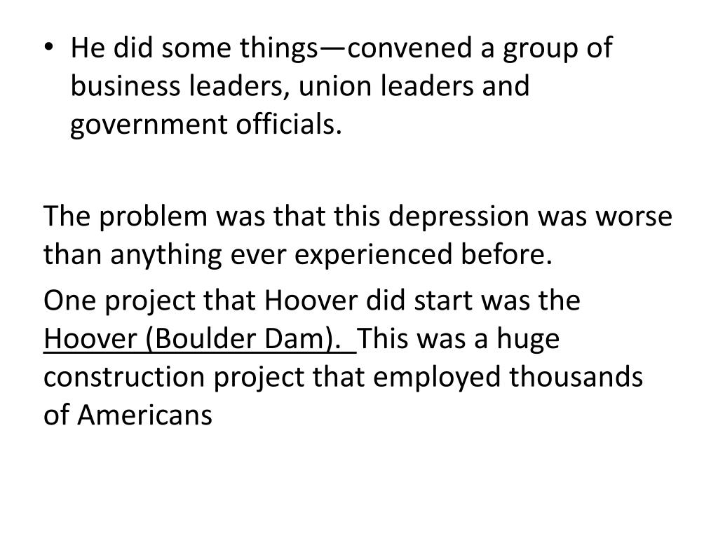 He did some things—convened a group of business leaders, union leaders and government officials. The problem was that this depression was worse than anything ever experienced before. One project that Hoover did start was the Hoover (Boulder Dam). This was a huge construction project that employed thousands of Americans