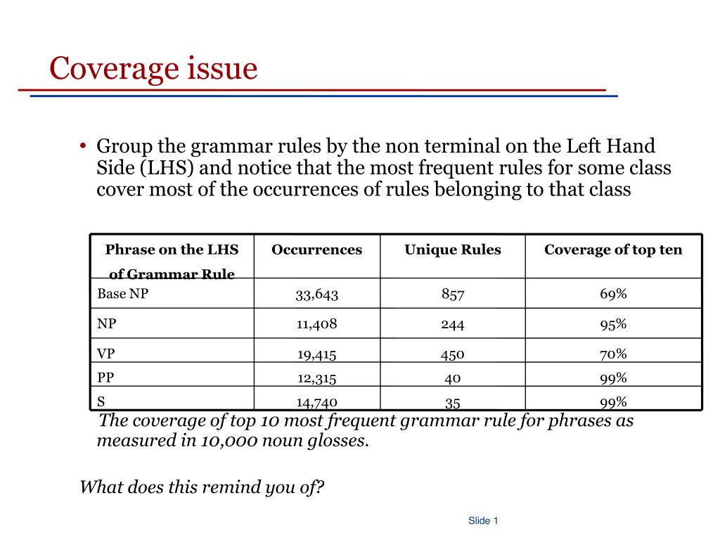Phrase on the LHS of Grammar Rule Occurrences Unique Rules Coverage of top ten Base NP 33,643 857 69% NP 11,408 244 95% VP 19,415 450 70% PP 12,315 40 99% S 14,740 35 99% Coverage issue • Group the grammar rules by the non terminal on the Left Hand Side (LHS) and notice that the most frequent rules for some class cover most of the occurrences of rules belonging to that class The coverage of top 10 most frequent grammar rule for phrases as measured in 10,000 noun glosses. What does this remind you of?