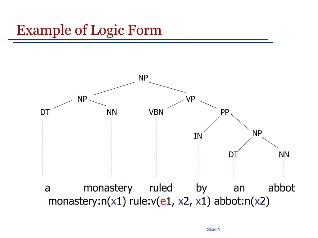 NP NP VP DT NN VBN PP NP IN DT NN a monastery ruled by an abbot Example of Logic Form monastery:n(x1) rule:v(e1, x2, x1) abbot:n(x2)