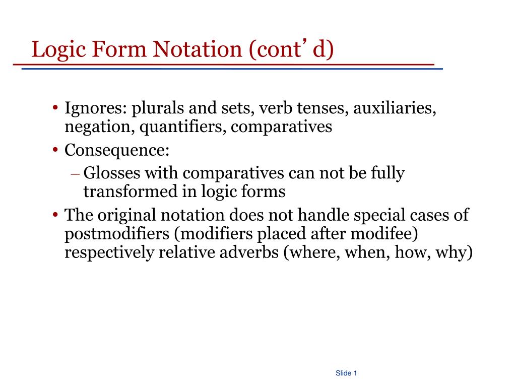Logic Form Notation (cont’d) • Ignores: plurals and sets, verb tenses, auxiliaries, negation, quantifiers, comparatives • Consequence: • Glosses with comparatives can not be fully transformed in logic forms • The original notation does not handle special cases of postmodifiers (modifiers placed after modifee) respectively relative adverbs (where, when, how, why)