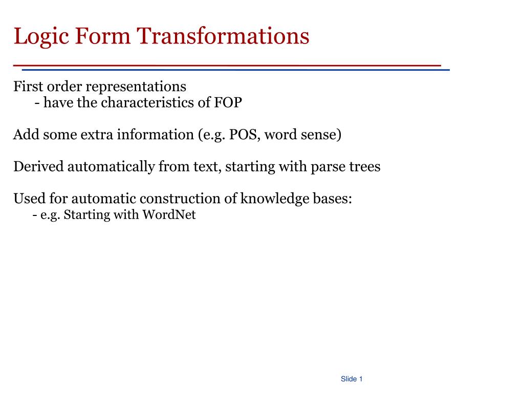 Logic Form Transformations • First order representations • - have the characteristics of FOP • Add some extra information (e.g. POS, word sense) • Derived automatically from text, starting with parse trees • Used for automatic construction of knowledge bases: • - e.g. Starting with WordNet