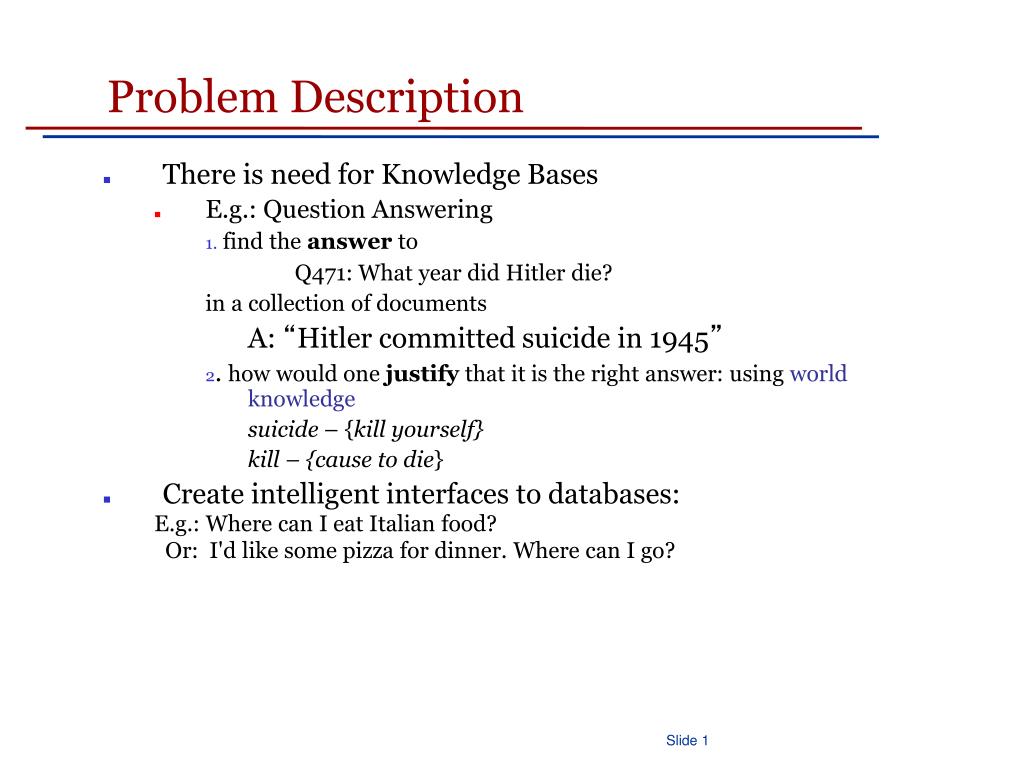 Problem Description • There is need for Knowledge Bases • E.g.: Question Answering 1. find the answer to Q471: What year did Hitler die? in a collection of documents A: “Hitler committed suicide in 1945” 2. how would one justify that it is the right answer: using world knowledge suicide – {kill yourself} kill – {cause to die} • Create intelligent interfaces to databases: E.g.: Where can I eat Italian food? Or: I'd like some pizza for dinner. Where can I go?