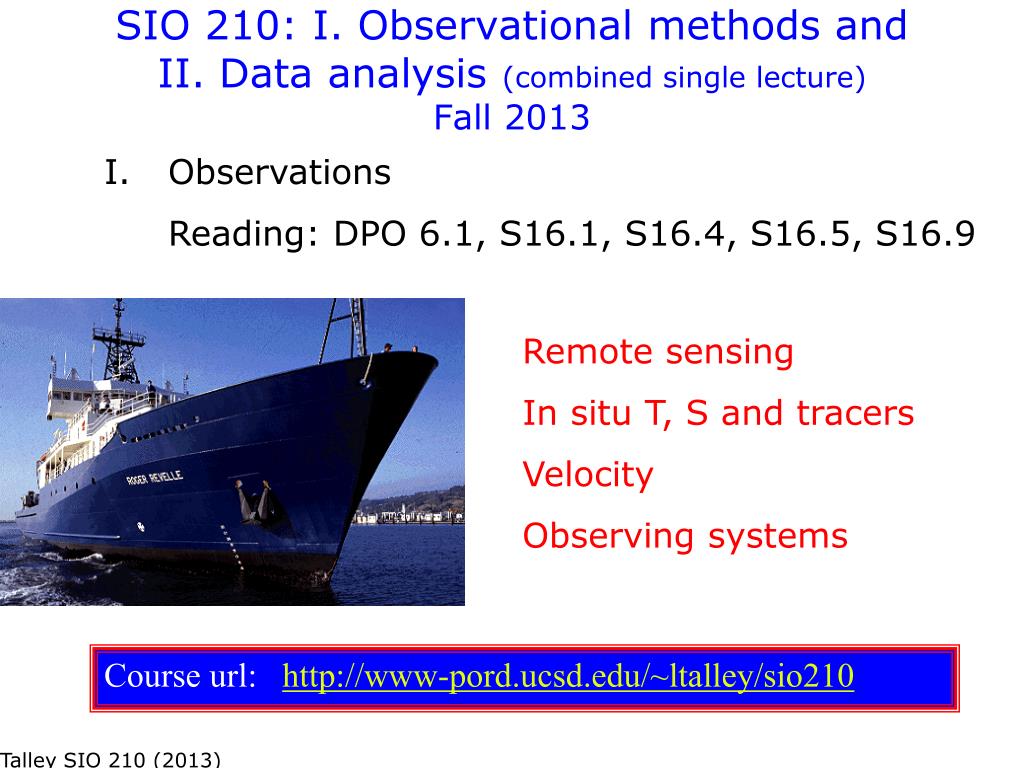 SIO 210: I. Observational methods and II. Data analysis (combined single lecture) Fall 2013. Observations Reading: DPO 6.1, S16.1, S16.4, S16.5, S16.9. Remote sensing In situ T, S and tracers Velocity Observing systems. Course url: http://www-pord.ucsd.edu/~ltalley/sio210.
