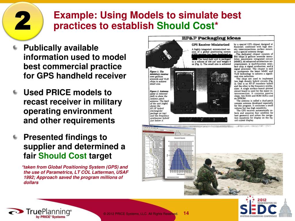 2 Example: Using Models to simulate best practices to establish Should Cost* • Publically available information used to model best commercial practice for GPS handheld receiver • Used PRICE models to recast receiver in military operating environment and other requirements • Presented findings to supplier and determined a fair Should Cost target *taken from Global Positioning System (GPS) and the use of Parametrics, LT COL Latterman, USAF 1992; Approach saved the program millions of dollars