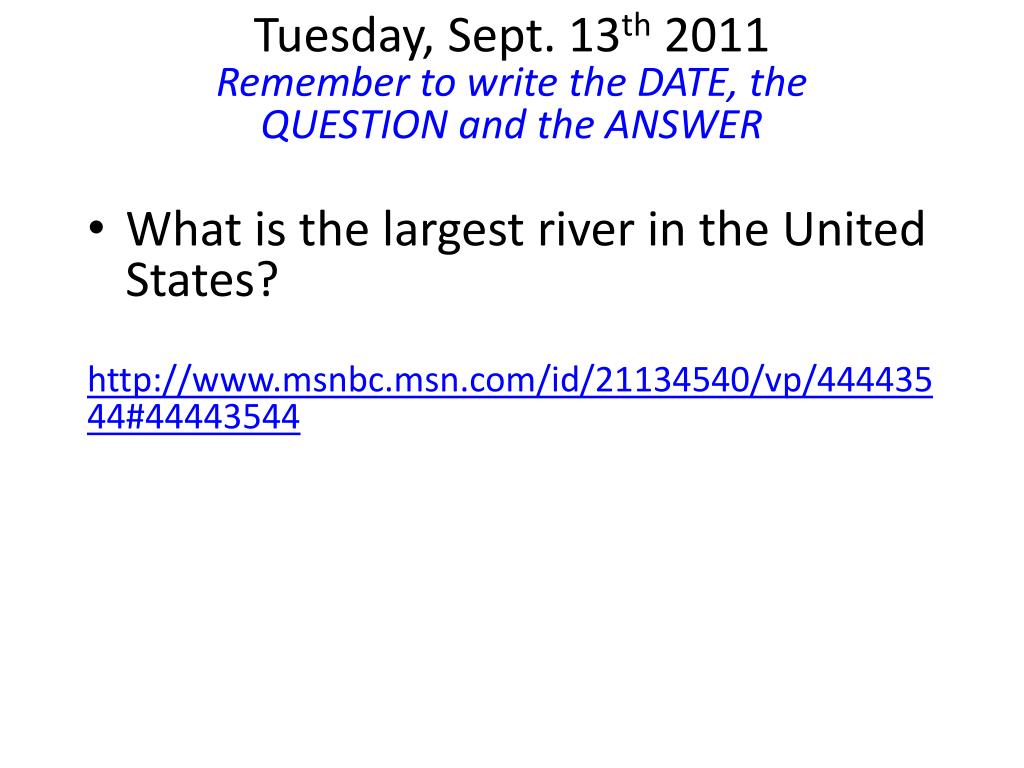 Tuesday, Sept. 13th2011Remember to write the DATE, the QUESTION and the ANSWER • What is the largest river in the United States? http://www.msnbc.msn.com/id/21134540/vp/44443544#44443544