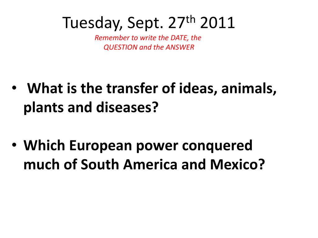 Tuesday, Sept. 27th 2011 Remember to write the DATE, the QUESTION and the ANSWER • What is the transfer of ideas, animals, plants and diseases? • Which European power conquered much of South America and Mexico?