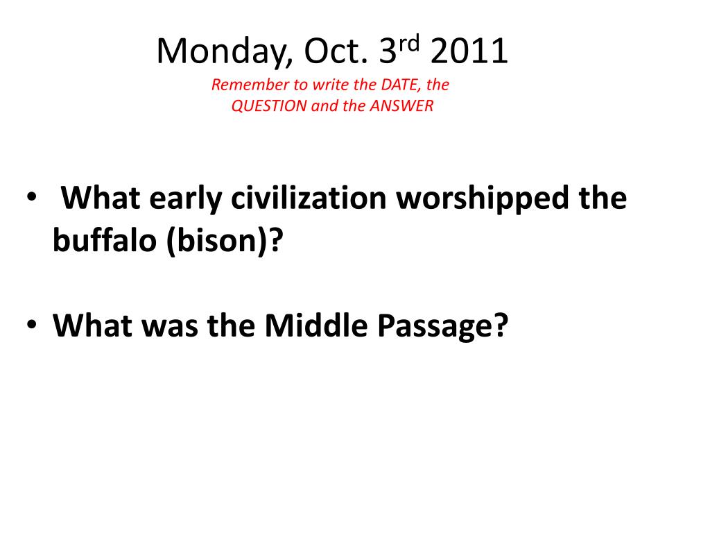 Monday, Oct. 3rd 2011 Remember to write the DATE, the QUESTION and the ANSWER • What early civilization worshipped the buffalo (bison)? • What was the Middle Passage?