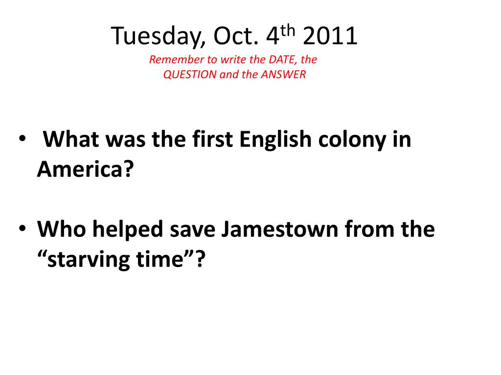 Tuesday, Oct. 4th 2011 Remember to write the DATE, the QUESTION and the ANSWER • What was the first English colony in America? • Who helped save Jamestown from the “starving time”?